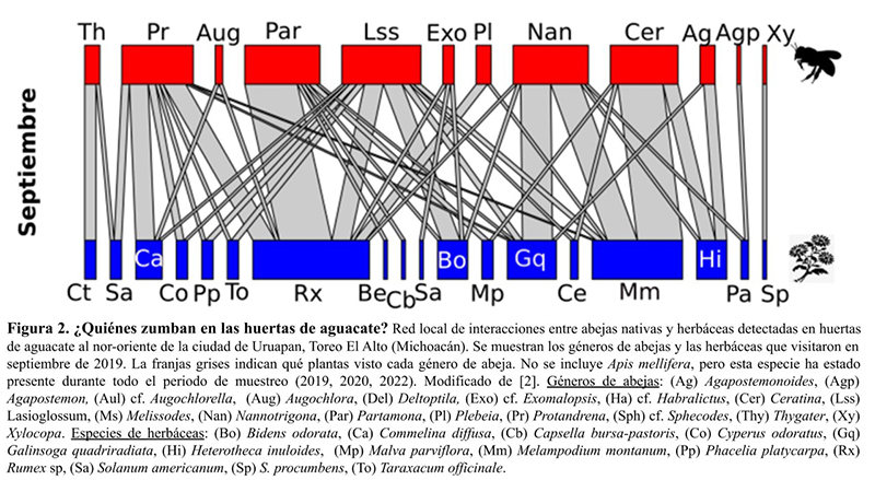 Para abordar parte de este problema, en el marco del proyecto AGUHA: Aguacates, Herbáceas y Abejas nativas estamos realizando la evaluación de las redes de interacción entre abejas nativas y las herbáceas que crecen dentro y los bordes de las huertas (o unidades productivas) en localidades de Michoacán [1]. Con esto buscamos generar información de línea base que permita diseñar o complementar estrategias de manejo agroecológico que reduzcan en la medida de lo posible, el impacto ambiental de las huertas de aguacate. En particular, buscamos ofrecer información sobre cómo cuidar aquellos organismos que nos brinda de forma gratuita, servicios ambientales altamente relevantes para la sustentabilidad agrícola del país (Ej., fijación y reciclaje de nutrientes en el suelo, control de plagas y polinización).