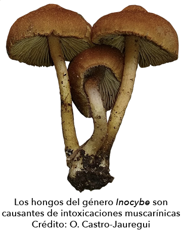 Intoxicación muscarínica: Las especies que lo causan pertenecen a varias especies de los géneros Inocybe y Clitocybe. Los síntomas aparecen de 15 a 2 horas después de la ingestión, produciendo un aumento en las secreciones como sudoración muy abundante, lagrimeo, salivación, goteo nasal, además de náuseas, vómitos, diarrea. La intoxicación no suele ser grave. El tratamiento es administrar atropina, en ocasiones se debe hacer lavado de estómago y rehidratación con sueros.