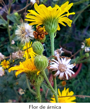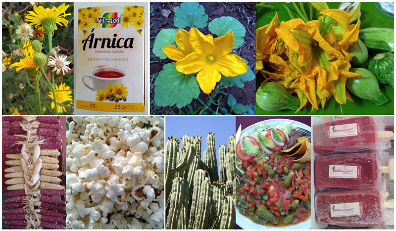 Plantas utilizadas con fines medicinales y comestibles, de izquierda a derecha y de arriba hacia abajo están representadas árnica, calabaza, maíz y jiotilla.