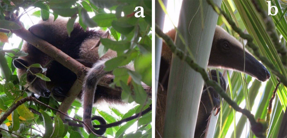 Oso hormiguero (Tamandua mexicana) sobre la copa de un árbol (a) y entre las pencas de un cocotero (b). Fotografías tomadas en la localidad de la Tunilla, Veracruz. Imagen: Sugey Dector