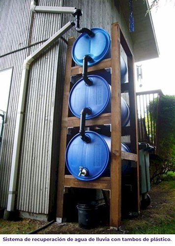 Sistema de recuperación de agua de lluvia con tambos de plástico. Foto: Ecoinventos.