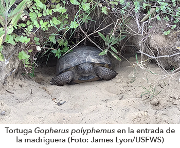 Otras especies animales también se benefician de la construcción de madrigueras, utilizándolas como refugio contra condiciones climáticas adversas, como el fuego y frío, y contra depredadores. Un ejemplo extraordinario es el de la tortuga Gopherus polyphemus, una especie nativa del sudeste de Estados Unidos, cuyas madrigueras pueden tener hasta 7 metros de profundad y 15 metros de largo (Figura 2). Más de 350 especies de animales ha sido descritas utilizando estas madrigueras, incluido ratones, ranas, decenas de invertebrados y especies en peligro de extinción como la serpiente Drymarchon couperi.Otro ejemplo es el armadillo gigantePriodontes maximus,que cavan madrigueras de más de cinco metros de profundidad en la región del Pantanal en América del Sur (Figura 3). Ocelotes, zorros, lagartos, tortugas y tayras fueron observados utilizando la profunda madriguera como refugio, así como otras tres especies de armadillos. Otros como los pecaríes, osos hormigueros, tapires y pumas utilizaron el montículo creado para descansar o bañarse en la arena, mientras que varias aves, roedores y lagartijas cazaban insectos en estos sitios. En La Mancha, Veracruz (México), un estudio realizado en un bosque tropical semideciduo reportó que los montículos de arena resultantes de la excavación de madrigueras (por especies indeterminadas) son utilizados para construcción de trampas por hormigas-león (Figura 4). Dado las hormigas-león prefieren un sustrato arenoso para construir sus trampas y este tipo de suelo es limitado en la superficie del bosque estudiado, los constructores de madrigueras juegan un papel clave en la promoción de estos sitios.