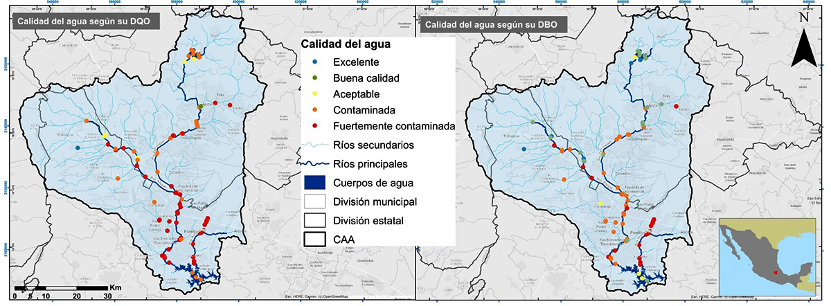 Distribución de la calidad del agua en la CAA según los indicadores de DQO y DBO. La mayoría de los puntos de muestreo presentan niveles de contaminación preocupantes, especialmente en la parte sur de la cuenca, donde predominan las categorías de agua contaminada y fuertemente contaminada. (Fuente: Elaboración propia con datos de CONAGUA, 2019)