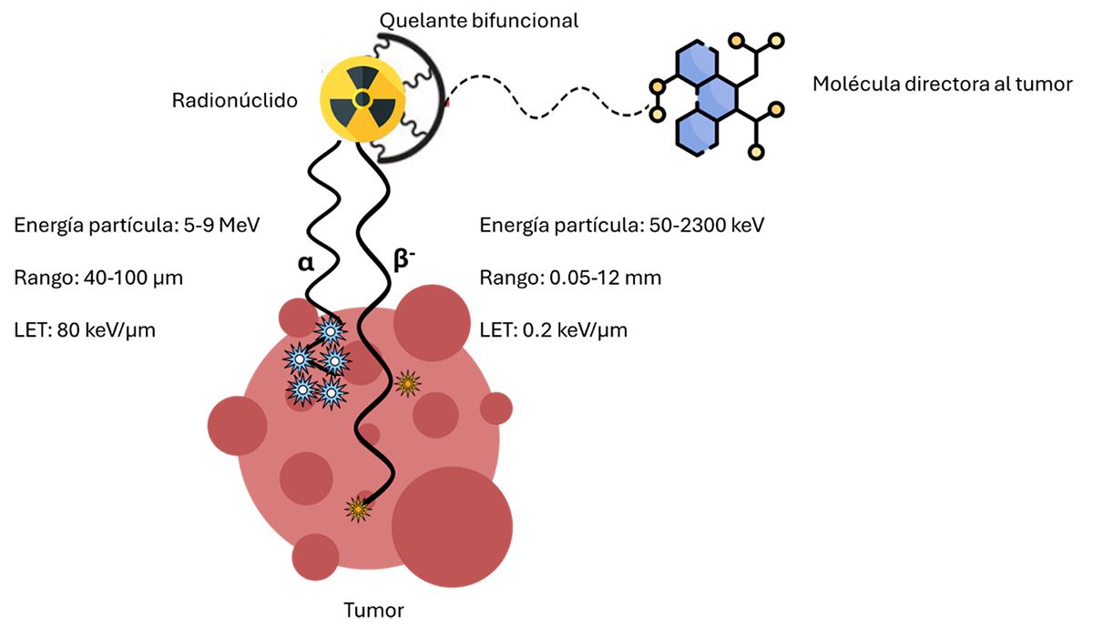 Figura 1. Diferencias en la emisión y alcance de partículas alfa y beta según el diseño molecular de radiofármacos para aplicaciones oncológicas.