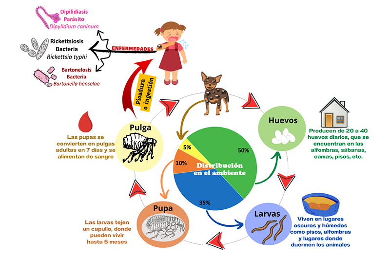 La pulga del perro y del gato han sido asociados a la transmisión de algunos patógenos que pueden causar enfermedades como la rickettsiosis que es provocada por la picadura de la pulga y por la bacteria Rickettsia typhi que causa dolores de cabeza, fiebre y ronchas en la piel. Otra enfermedad que también puede tener su origen por estas pulgas es la enfermedad del arañazo del gato, causada por la bacteria Bartonella henselae, la cual se manifiesta con vómitos, fiebre y falta de coordinación de los movimientos de nuestro cuerpo. La ingestión accidental de la pulga que porta el parásito Dypilidium caninum, causa la enfermedad dipilidiasis y algunos de sus síntomas principales son la diarrea y la hinchazón del abdomen. Estas 3 enfermedades son poco conocidas, con alta incidencia y que se caracterizan por signos y síntomas que pueden confundirse con otras enfermades, dificultando su diagnóstico.
