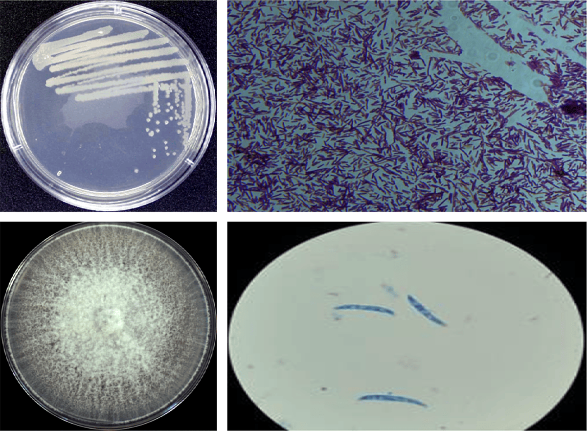 Microbios aislados de árboles de aguacate. Arriba a la izquierda, colonias bacterianas, a la derecha, tinción de sus células, abajo a la izquierda, colonia de un hongo patógeno, a la derecha, tinción de sus esporas.