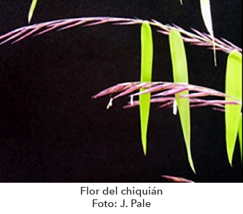 agua a cualquier bambú cuando sea recién sembrado o propagado. La floración del chiquián, es igual que la de los demás bambúes, un tema aún inexplicable. Mientras que algunos florecen anualmente, otros solo lo hacen en intervalos, comprendidos entre 3 y 120 años. Sin embargo, se observaron algunas plantas en floración del chiquián en el año de 2002-2003. Su flor es la de una gramínea, es decir como la del trigo, maíz, avena, cebada, sorgo y la caña de azúcar. Son de color guinda y cuando está finalizando la floración son de color pardo (Figura 3).