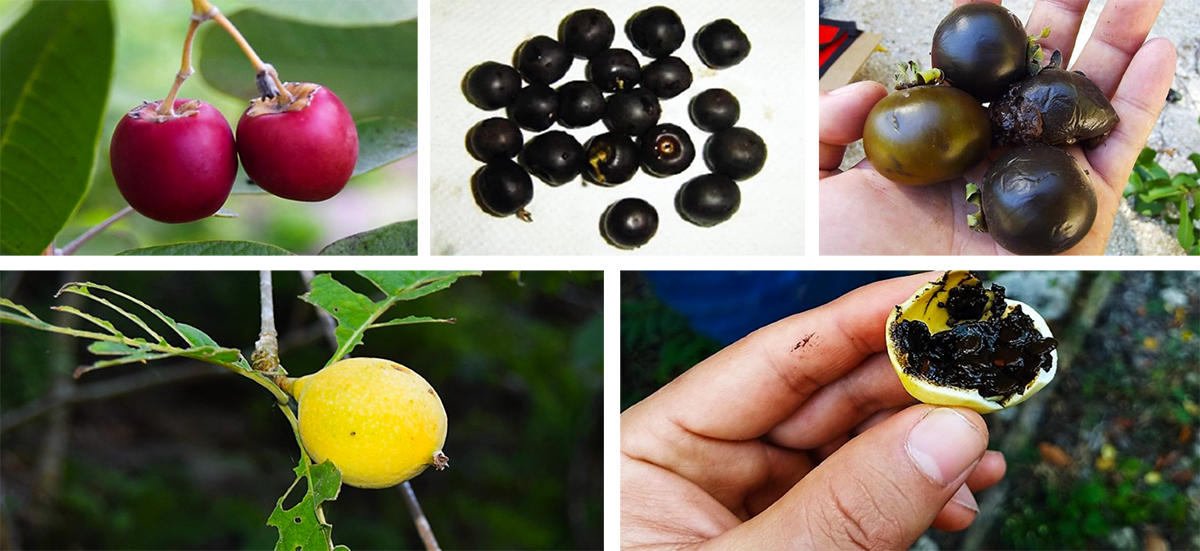 Las frutas son quizás los alimentos que presentan mayor variación en sus colores, desde los verdes y amarillos o naranjas en la guayaba, los rojos intensos del tomate y la fresa o tonos azulados en arándano azul (blueberry). Los pigmentos de estos alimentos son bastantes conocidos y se deben generalmente a la presencia de carotenoides (amarillos, naranjas o rojos), antocianinas (azul a rojos) o betalainas, como en el caso del betabel y los frutos de los cactus, como tunas o pitayas. Sin embargo, existen algunas frutas menos conocidas que producen una pulpa comestible completamente negra u oscura, debido a la presencia de melaninas vegetales o piomelaninas (melaninas sin nitrógeno), tal es el caso de los zapotes negros (género Diospyros); los papaches o crucetillas (género Randia); los jícaros, tecomates o ayales (género Crescentia); o los coyotomates, igualamas o uvalamas (género Vitex).