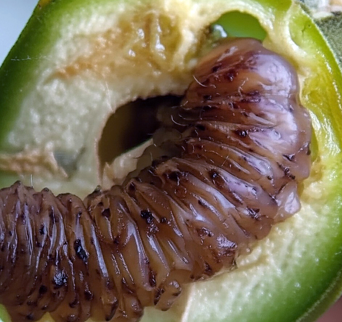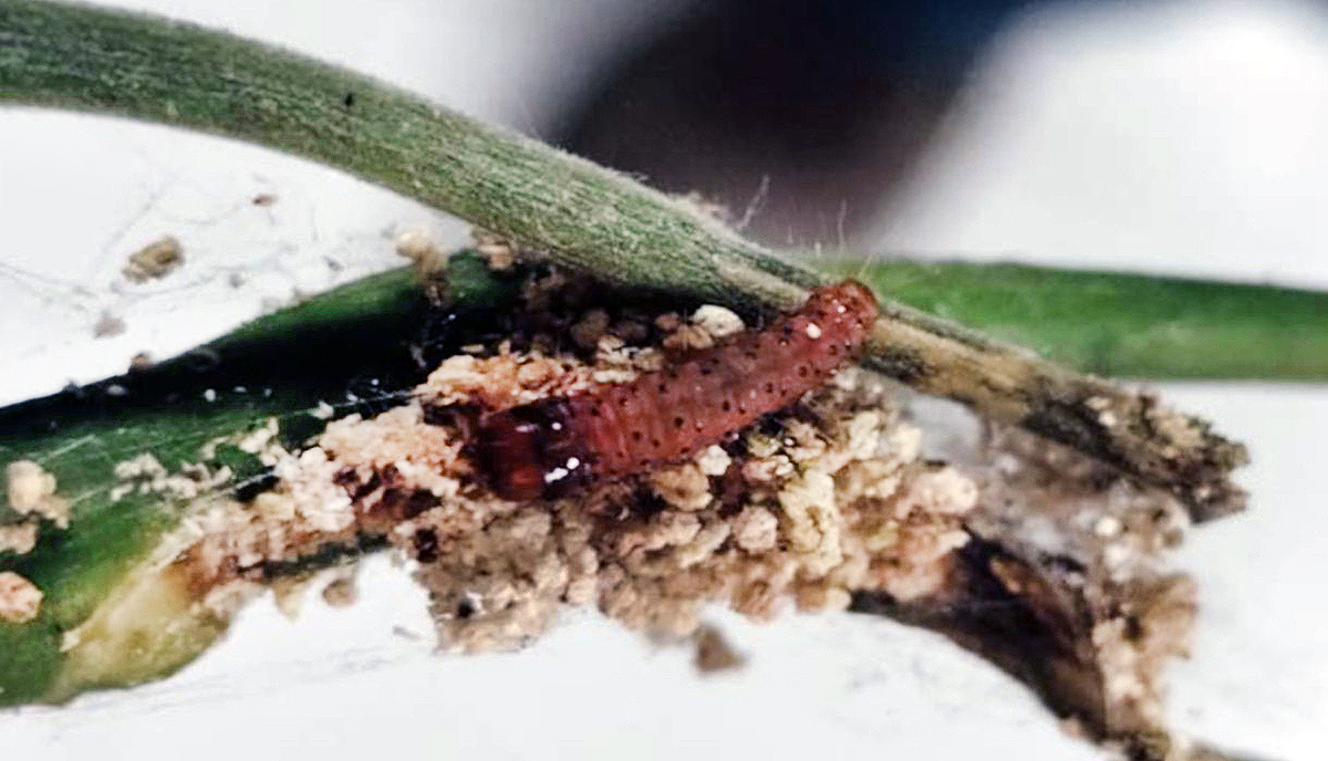 Larva de H. grandella en un brote de un árbol de cedro joven. Fotografía tomada por AAT y editada por IMHV