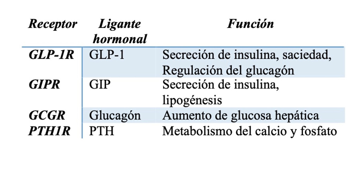 Primero hay que aclarar que el GLP-1 (glucagon-like peptide-1) es una hormona intestinal que estimula la secreción de otra hormona muy importante, la insulina, mediante la unión a su receptor GLP-1R. Posteriormente la insulina inhibe la liberación de glucagón y ralentiza el vaciado gástrico, lo que contribuye a una sensación de saciedad prolongada. Estos efectos combinados han generado un “boom” terapéutico, ya que GLP-1 se ha convertido en una herramienta tanto para el control de la glucemia como para la pérdida de peso. También cabe mencionar que esta hormona se une a proteínas específicas que están en la membrana celular y se denominan receptores acoplados a proteínas G (GPCRs, por sus siglas en inglés); estos receptores cumplen con múltiples funciones celulares cuando sus hormonas ligantes se acoplan. Por ejemplo: