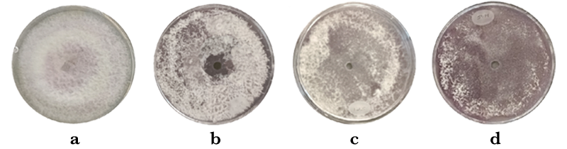 Crecimiento del hongo de Fusarium oxysporum expuesto a diferentes tratamientos en una concentración de 1 mg/mL. a) sin tratamiento, b) quitosano, c) NPs de ZnO y d) NPs de ZnO-quitosano. (Imágenes: Iliana C. Ruiz Leyva)