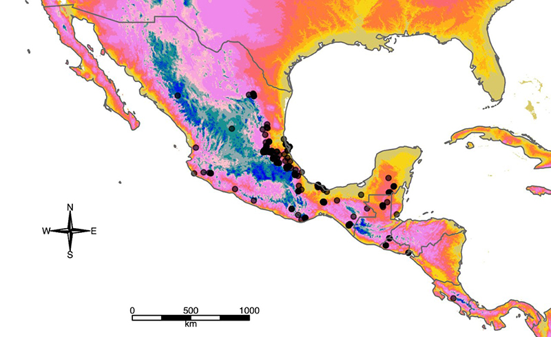 Mapa de distribución de Smilax aristolochiifolia en Mesoamérica. Elaboró: Arith Pérez-Orozco