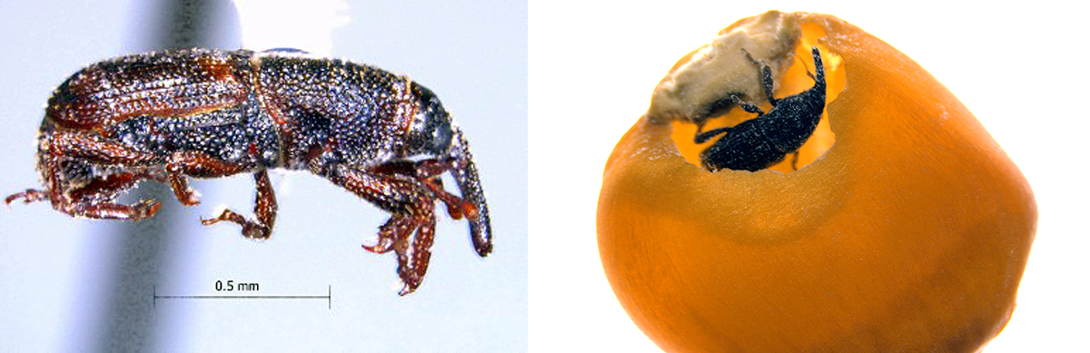 Fig 2. Gorgojo del maíz. Fig 3. Maíz infestado por gorgojo del maíz. (Fotos por Ayline García)
