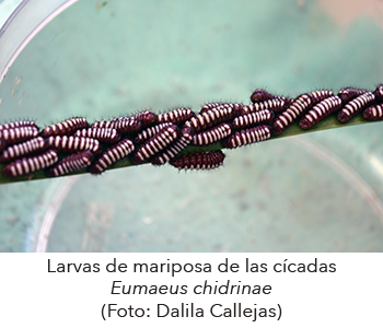 Slider: Mariposa de las cícadas, Eumaeus chidrinae, poniendo sus huevecillos en una hoja de cícada.(créditos: Dalila Callejas)