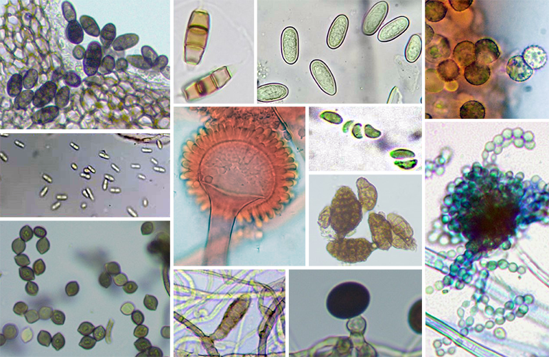 Diversidad de esporas de hongos, con formas, colores y tamaños variados. Algunas con paredes gruesas, ornamentadas o con proyecciones.