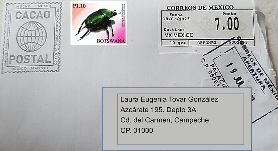 Ejemplo de carta enviada vía correo postal. Fuente del sello de escarabajo (centro superior): Animal Kingdom