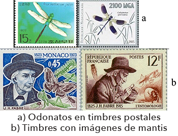 Las libélulas (Odonata) son también populares en los timbres postales (Fig 3a). En varios países orientales como Japón y China, la presencia de las libélulas y caballitos del diablo está relacionada con cosas positivas (buena suerte, buenos deseos) y estos insectos simbolizan el coraje, la fuerza, la victoria y la felicidad. Se les considera benéficos y favorables, probablemente debido a su abundancia en los campos de cultivo de arroz, un alimento muy importante para esas culturas. Históricamente, Japón fue el primer país en representar un odonato en un sello postal en 1923 y hasta 2020 había un total de 426 estampillas emitidas por 113 países. Pese a que para algunos pueblos occidentales la percepción que se tiene hacia estos insectos está vinculada a demonios, duendes y brujas y con ello a cuestiones negativas (mala suerte, calamidades, infortunios, desastres) la tendencia ha ido cambiando. Algunos países americanos han emitido sellos con estos organismos, por ejemplo, el caballito del diablo Mecistogaster ornata, que tiene una longitud de hasta 10 cm y una envergadura alar de 12 cm fue representada en un sello de El Salvador en 1985. Los odonatos también han sido incluidos en estampillas como parte de la cadena alimenticia, esta interacción se representa en el sello emitido por China en el 2006 que ilustra al abejaruco cola azul, un ave migratoria (Merops philippinus) cazando a la libélula halcón de los pantanos de cola carmesí (Orthetrum pruinosum neglectum). Por último, Estados Unidos y Suiza en 2009, a través de la ONU, emitieron una serie de estampillas con el tema “Especies en peligro”, donde se ilustra a dos caballitos del diablo: Agrion imperator y Coenagrion mercuriale, asimismo, España emitió una serie de cuatro estampillas en 2015 con el tema “Especies protegidas”, entre ellas la libélula Onychogomphus forcipatus.