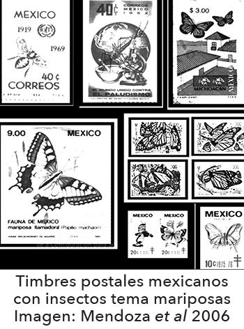 Las estampillas postales son un buen medio de información para transmitir información a los diferentes sectores de la población sobre los insectos y en general sobre biodiversidad. Mientras las personas de las oficinas postales utilicen sellos se tendrá la oportunidad de conocer y, por qué no, de concienciar a otros sobre la conservación de otras formas de vida en nuestro planeta. Ha sido política del Servicio Postal Mexicano (Fig. 2), a través de sus colecciones filatélicas, el sumarse a los esfuerzos que se realizan en pro de la conservación de las especies en peligro de extinción y el difundir aspectos importantes de la biodiversidad, para tratar de formar una cultura ecológica entre nuestra población. Esta preocupación ha llevado al correo mexicano a plasmar 345 especies de la fauna y 60 de la flora de nuestro país, habiéndose elaborado tres planillas. En una de ellas: "Conservemos las Especies de México” se hace alusión a varios insectos.