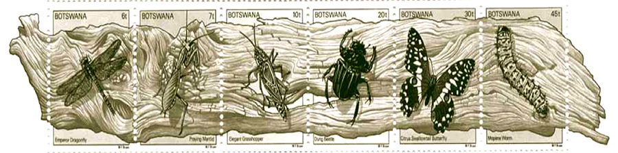 Insectos en timbres pósales africanos. Imagen: Gómez y Junghans (2022)