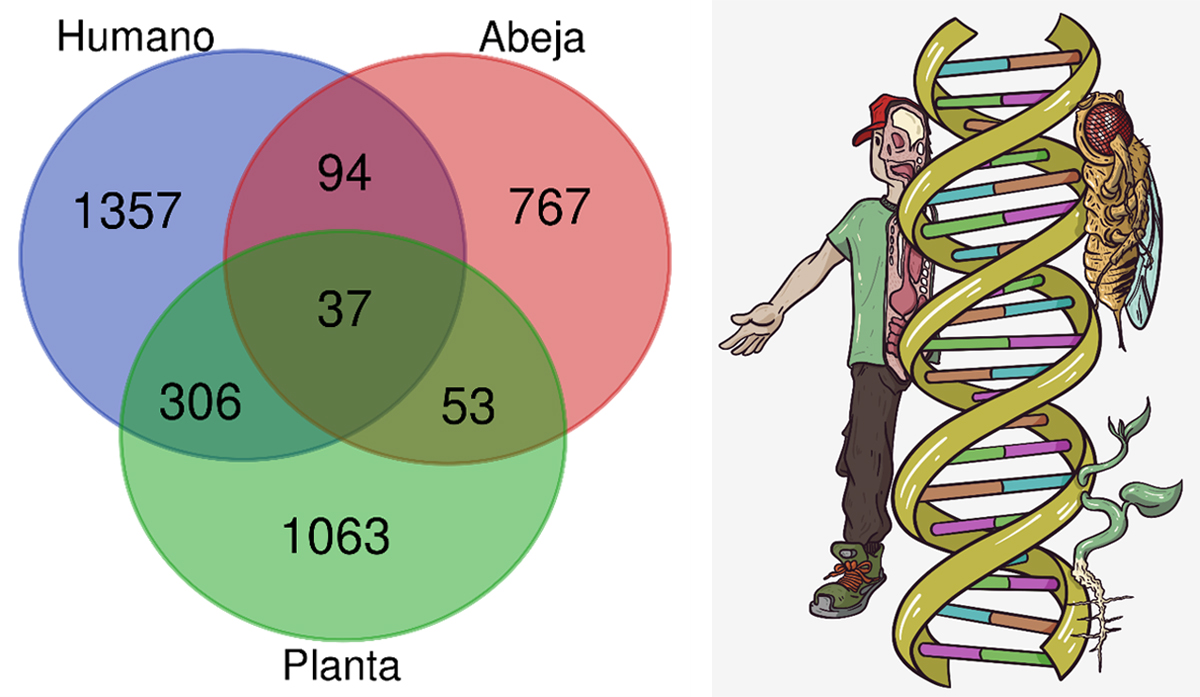 Si pensamos en un nivel más químico de nuestra biología, encontramos que el ADN es el repositorio de la información, la cual debe ser descodificada para formar proteínas y algunas de éstas participan en la producción de compuestos químicos. Resulta interesante encontrar coincidencias químicas entre plantas, insectos y humanos, a pesar de que el conocimiento de la composición química de las especies es mucho menor en comparación con lo que sabemos respecto a los genes. Utilizando la información disponible en la base de datos de Lotus (que alberga la información y búsqueda de compuestos naturales químicos) respecto a la composición química de la planta Arabidopsis thaliana (la planta modelo más estudiada), abejas y humanos, encontramos que 37 compuestos químicos, equivalentes al 1 %, se comparten entre las tres especies (Figura 2). No es de extrañar que entre los compuestos químicos compartidos se encuentren algunos relacionados con el ADN y con los lípidos relacionados con las membranas de las células. De manera sorprendente, hay más compuestos químicos compartidos entre el humano y la planta A. thaliana (343 compuestos químicos equivalentes al 9 %), en comparación con el humano y las abejas (131 compuestos químicos equivalentes al 4 %) (Figura 2). Esto quizás se pueda deber a nuestra dieta basada principalmente en plantas y concuerda perfectamente con el dicho de que somos lo que comemos. Por otro lado, las abejas y la planta A. thaliana comparten 90 compuestos químicos equivalentes al 2 % (Figura 2).