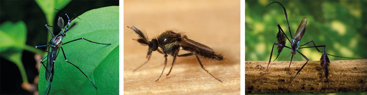 Dípteros que se desarrollan en fitotelmas. De izquierda a derecha, Mosquito Toxorynchites sp., Jején Forcipomyia sp. y Mosquito Sabethes sp.