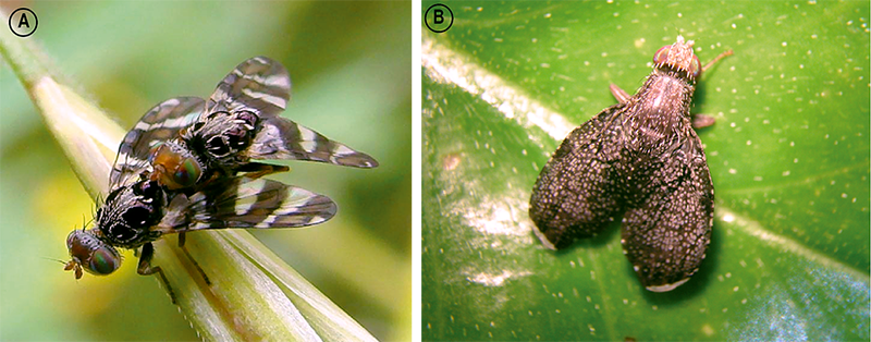 Especies nativas de México (Tephritidae) utilizadas para bio-control de malezas. A) Procecidochares utilis (foto: ©Ana Lucínia de Freitas, NaturData-Portugal). B) Eutreta xanthochaeta (foto: Vicente Hernández)