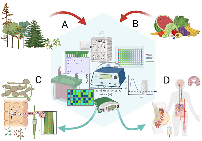 Esquema de trabajo para la búsqueda de Oti y de otras proteínas de importancia en la salud humana o en la adaptación al estrés biótico y/o abiótico en las plantas. Las fuentes biológicas de nuevas proteínas pueden encontrarse en árboles de importancia forestal (A), en las plantas empleadas en la medicina tradicional y/o en aquellas que se utilizan para consumo (B). Para encontrar las candidatas se realizan procedimientos bioquímicos y moleculares. Posteriormente las proteínas seleccionadas se analizan en sistemas de interacción planta patógeno (C) o en modelos celulares humanos (D). La figura se elaboró con BioRender.