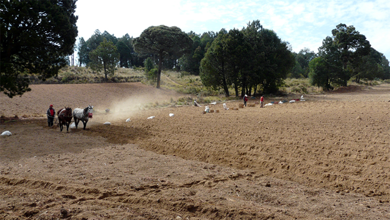 En el Estado de Veracruz se siembran alrededor de 6,400 ha, de las cuales se cosechan más de 160,000 ton. El Valle de Perote y las laderas del Cofre de Perote y del Pico de Orizaba, localizadas entre los 1,500 y 3,000 msnm, son ideales para el cultivo de la papa por el clima de la región. El cultivo de papa en las laderas del Cofre de Perote inició hace más de 80 años, los agricultores de las comunidades han adquirido gran experiencia en su manejo, incluso continúan preparando sus terrenos para la siembra con yunta de caballo, lo que evita la compactación del suelo (Figura 1). También han vivido los problemas de la introducción de diversos patógenos como el nematodo dorado de la papa (Globodera rostochiensis) y de la implementación de las cuarentenas.