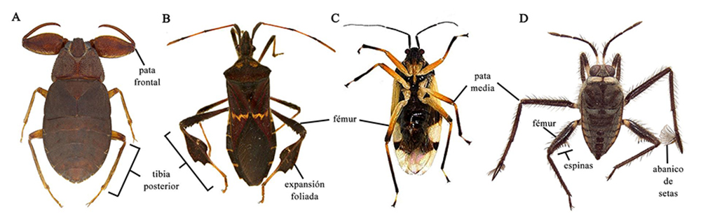 Distintas modificaciones en patas de chinches. (A) Patas frontales raptoras y tibias y tarsos de patas posteriores aplanados en la chinche acuática Lethocerus collosicus. (B) Patas anteriores raptoras y posteriores alargadas con sedas natatorias en la chinche acuática Notonecta sp. (C) Patas frontales raptoras y tibias posteriores con sedas natatorias en la chinche acuática Limnocoris signoreti. (D) Patas frontales raptoras en la chinche terrestre Isocondylus sp. Fuente: Ximena Galindo-Malagón y Daniel Reynoso-Velasco.