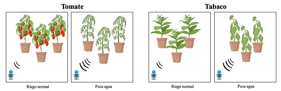 No nos referimos al ruido que hacen las hojas cuando las agita el viento o son golpeadas por la lluvia. Nos referimos a la capacidad que tienen las plantas de emitir sonidos de ondas ultrasónicas6. Dichos sonidos no solo se producen cuando las plantas son sometidas a algún estrés, sino que sorprendentemente el sonido de una planta estresada por falta de agua es diferente al de una planta afectada por un daño mecánico (Figura 2). Si bien la frecuencia de los sonidos de ondas ultrasónicas se encuentra por encima del sonido audible para los humanos, estos sí pueden ser detectados por insectos o incluso otras plantas, por lo que se propone como un mecanismo de comunicación entre plantas, que serviría para alertar de las condiciones ambientales, como sequía o ataques de organismos depredadores6.