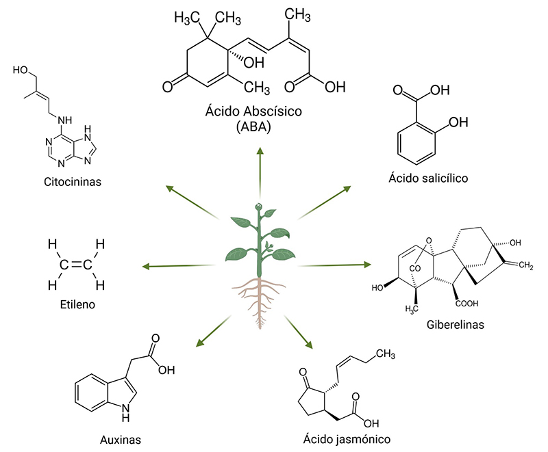 Estructuras químicas de algunas fitohormonas. Las plantas producen hormonas importantes para su crecimiento y desarrollo, que se diferencian por su estructura química. (Creado con BioRender.com por la MC. Mónica Muñoz-Contreras).