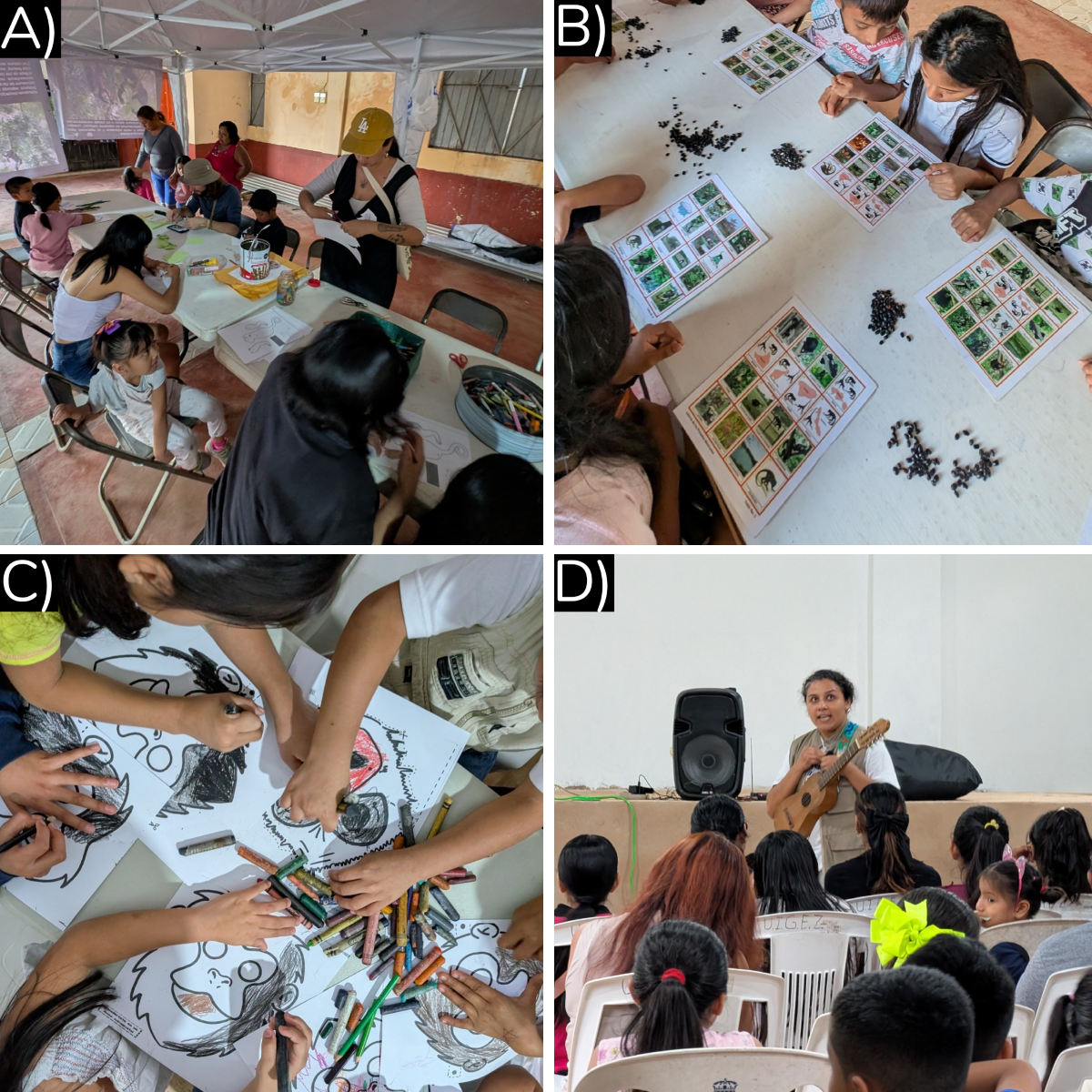 Figura 1. Ejemplo de las actividades que se llevaron a cabo en los festivales "Changos y monos va a tu comunidad"; A) Creación y coloreo de títeres de primates silvestres mexicanos, B) Lotería temática sobre características variadas de los primates silvestres mexicanos, C) "Transfórmate en un mono" y D) Cuento Musical acompañada de son jarocho. Fotografías: Rodrigo Cuate.