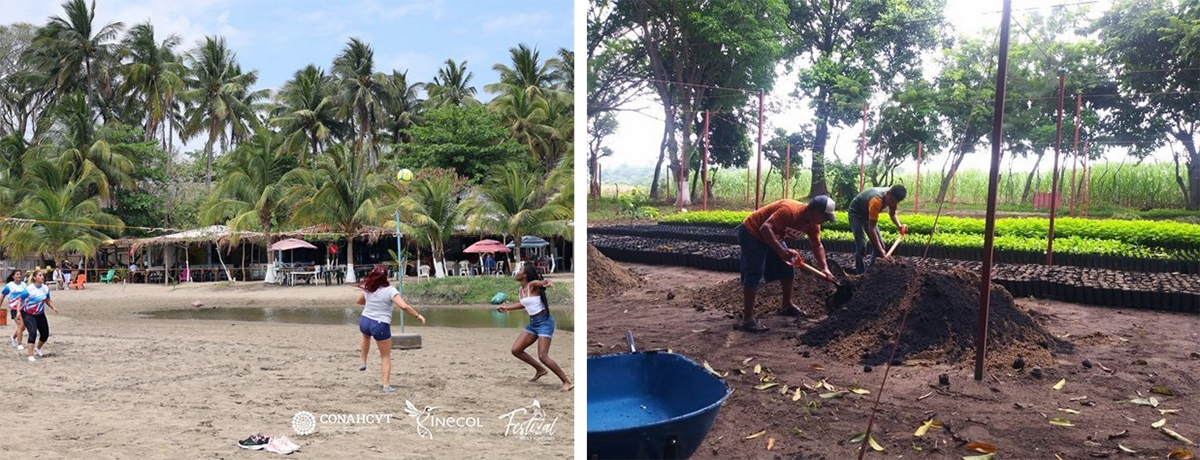Fig 1. Foto A. Playa La Mancha. Foto B. EcoGuías trabajando en el vivero comunitario. Crédito de las fotografías: EcoGuías La Mancha.
