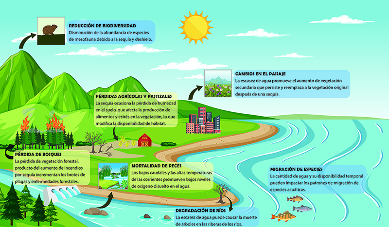 Los ríos, lagos y humedales son especialmente vulnerables a las sequías ecológicas. Estos cuerpos de agua pueden experimentar una reducción de su volumen, su nivel y un aumento en su temperatura, lo que provoca la degradación y pérdida de hábitat. Como consecuencia, las poblaciones de peces pueden disminuir debido a la pérdida de zonas adecuadas para la reproducción y la alimentación. Además, al afectar a la diversidad y abundancia de especies, las sequías ecológicas pueden tener consecuencias a largo plazo para la biodiversidad. Por otro lado, las sequías ecológicas también afectan la provisión de servicios ecosistémicos, como la purificación del agua, el secuestro de carbono y la fertilidad del suelo, por lo que sus impactos tienen repercusiones directas en el bienestar humano y los medios de subsistencia.