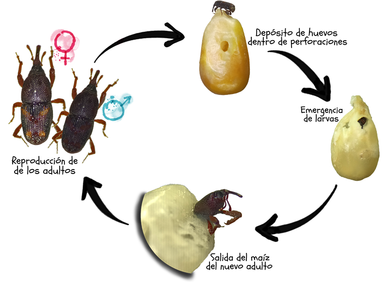 Ciclo de vida del gorgojo de maíz. Primero, los adultos se reproducen y las hembras depositan sus huevos dentro de las perforaciones que hacen en los granos. Los huevos son cubiertos con una película de moco y posteriormente, los huevos eclosionan y de ellos emergen las larvas (una por huevo). Dentro del grano, la larva se alimentará de los nutrientes del grano hasta alcanzar la etapa de adulto y será entonces cuando saldrá del grano para repetir el ciclo. Cada hembra adulta puede producir hasta 250 huevos. El ciclo de vida del gorgojo varía entre 30 a 113 días dependiendo de la temperatura del ambiente. Figura elaborada por Essicka García-Saldaña.
