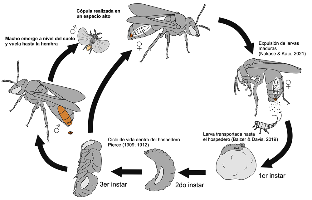 Fig 3. Ciclo de vida de un estrepsíptero (parasitando una abeja)