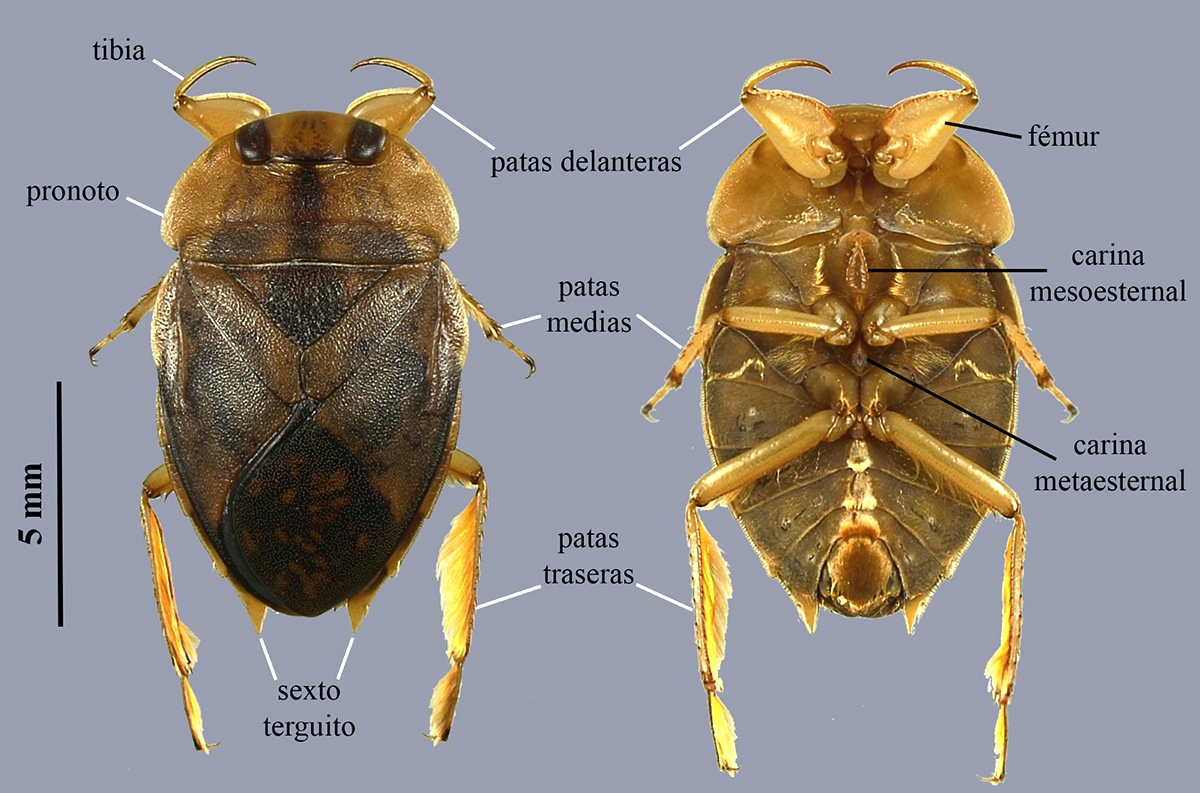 Dentro del Orden Hemiptera se encuentra un grupo de insectos que en su mayoría habita bajo el agua, el infraorden Nepomorpha, también conocidas como chinches acuáticas, las cuales, a pesar de carecer de la gama de colores brillantes y patrones que hacen tan llamativos a otros grupos de insectos, son interesantes y vale la pena detenerse y prestarles atención. Este infraorden comprende alrededor de 2,000 especies clasificadas en 11 familias, donde la gran mayoría son depredadores. Con algunas excepciones, estos insectos poseen antenas cortas localizadas en cavidades especiales debajo de los ojos, característica que está asociada a la vida acuática, pues al no tener antenas largas y expuestas su desplazamiento en el agua es más fluido al presentar menos resistencia (forma hidrodinámica). Los naucóridos, una de estas 11 familias, son habitantes de cuerpos de agua dulce donde la corriente puede ser muy fuerte (grandes ríos, rápidos y cascadas), moderada (ríos y arroyos), o prácticamente nula (lagos); se alimentan de otros invertebrados acuáticos como larvas de libélulas y de mosquitos, y en algunos casos también de moluscos. Son superficialmente parecidos a los cercanamente emparentados belostomátidos (cucarachas de agua), pero se diferencian de estos por su tamaño considerablemente más pequeño, además de no tener apéndices respiratorios en el extremo posterior del abdomen; en cambio, la mayoría de naucóridos respiran por medio de una burbuja de aire que capturan al acercarse a la superficie del agua, unos pocos poseen una estructura denominada plastrón, la cual le permite respirar bajo el agua al extraer directamente el oxígeno que está disuelto en el agua.
