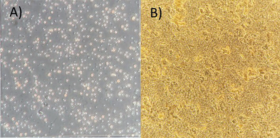 A) Cuerpos de oclusión de baculovirus observados en el microscopio (x400 aumentos). B) Cuerpos de oclusión de baculovirus protegidas con nanopartículas metálicas y polímeros (x400 aumentos)