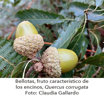 Las bellotas son el fruto que caracteriza y da origen a los árboles conocidos como encinos, robles o duelas (Género Quercus de la Familia Fagaceae). Las reconocemos porque son nueces cubiertas en su base por una cúpula conformada por muchas escamas (Figura 1). México es el país que alberga la mayor diversidad de especies de encinos del planeta (aproximadamente el 40%) con cerca de 168 especies, de las cuales 104 son endémicas (sólo se distribuyen en México). Los encinos se desarrollan desde ambientes semiáridos como matorrales, hasta bosques templados y secos, pero especialmente en bosques tropicales húmedos de montaña, como el bosque de niebla; en otras palabras, están en casi todos los ecosistemas del país. Además forman parte importante de la estructura de muchas comunidades vegetales, en donde suelen ser árboles –o a veces arbustos– que conviven con hasta más de tres especies distintas del género Quercus en un mismo fragmento de bosque. En estos sitios, aportan una gran cantidad de materia orgánica al suelo con la caída de su hojarasca (muchos son caducifolios) y brindan hábitats y recursos para muchas especies de aves, mamíferos, insectos, anfibios, otras plantas epífitas y hongos (en forma de ectomicorrízas, por ejemplo).