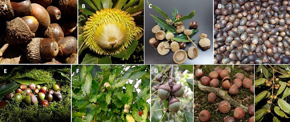 Bellotas de las especies de encinos del Santuario del Bosque de Niebla: A) Quercus germana (C.Gallardo); B) Quercus insignis (C.Gallardo); C) Quercus lancifolia (C.Gallardo); D) Quercus sapotifolia (C.Gallardo); E) Quercus pinnativenulosa (E. Rodríguez); F) Quercus castanea (R.Carral); G) Quercus paxtalensis (C. Gallardo); H) Quercus xalapensis (E. Rodríguez); I) Quercus sartorii (C.Gallardo)