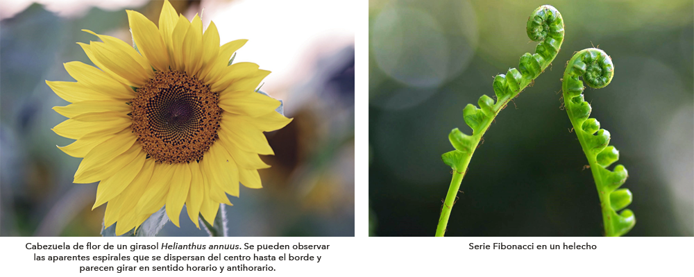 De esta manera, la relación entre el número áureo y la sucesión de Fibonacci se expresa en la disposición de hojas en las plantas; por ejemplo en los girasoles y helechos, en la distribución de pétalos en las flores y en innumerables patrones del mundo vegetal. Si contáramos el número de espirales en direcciones opuestas, a menudo encontraremos que estos números son consecutivos en la serie de Fibonacci; esta disposición optimizada permite una exposición máxima al sol y un eficiente uso del espacio, con lo que se evidencia cómo la matemática establece la arquitectura de las flores.
