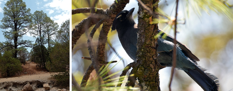 Ave conocida en la Michilía como chivito (Cyanocitta stelleri), desde el alto de un encino. Llamada así por su copete, el cual se asemeja a labrada invertida de una cabra o chivo. Foto: paisaje ASC y ave JRL