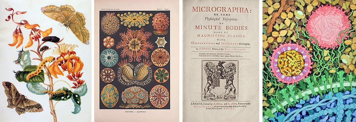 De izquierda a derecha, Ilustración sobre el ciclo de vida de las mariposas por Sibylla Merian, lámina de ascidias marinas por Ernst Haeckel, portada del libro Micrographia de Robert Hooke y fragmento de la ilustración del virus de Zika de David Goodsell