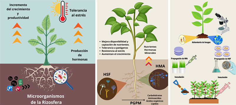 Entre los elementos más valiosos en la producción de los biofertilizantes están los microorganismos promotores de crecimiento vegetal, conocidos como PGPM (Plant Growth-Promoting Microorganism), los cuales son aislados de diversos ambientes, con la habilidad potencial de favorecer el crecimiento de las plantas; entre estos microorganismos, destacan los hongos solubilizadores de fósforo y los hongos micorrícicos arbusculares (Figura 2).