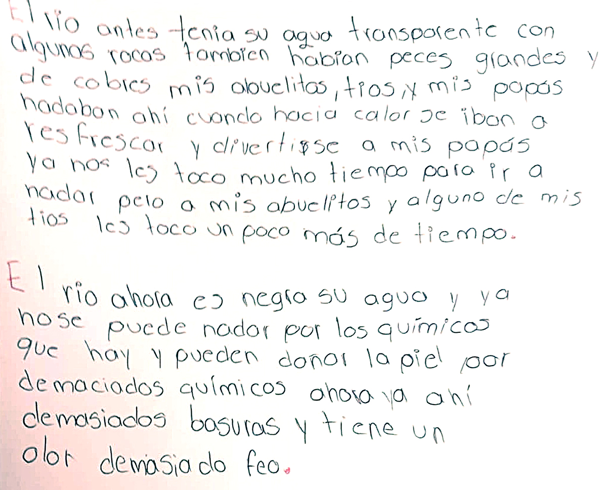 - Las niñeces lo visualizan como "el problema" en lugar de un elemento natural valioso. Esto sugiere la necesidad de una mayor sensibilización sobre la importancia ecológica del río y su papel en la vida comunitaria.