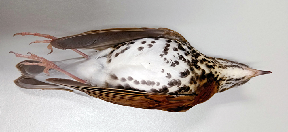 Las aves migratorias como el Zorzal moteado (Hylocichla mustelina), también experimentan colisiones en áreas de migración e invernación