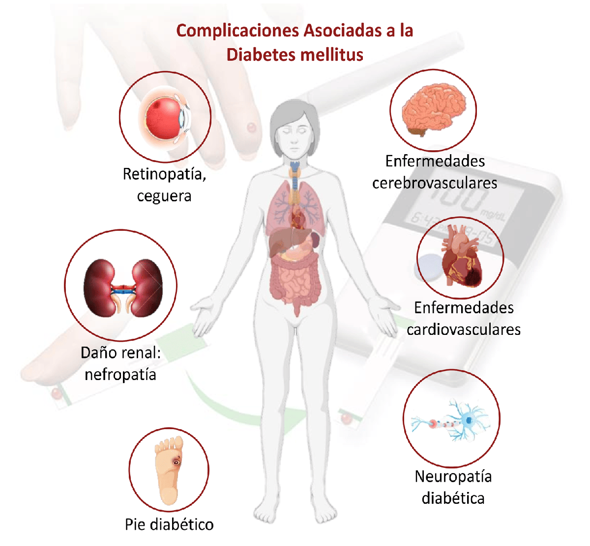 Representación gráfica de las complicaciones asociadas a la diabetes mellitus, elaborada por Erika Valencia con BioRender