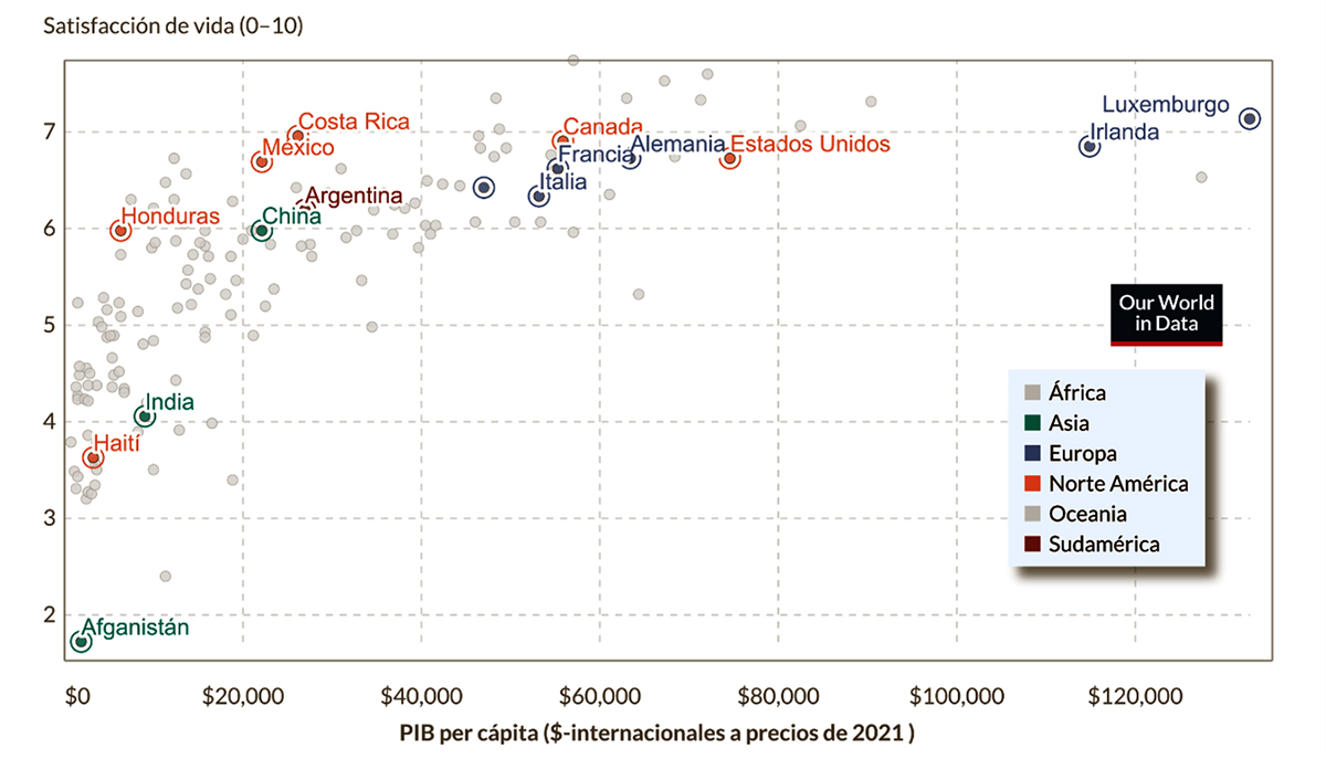 Fig. 1 Relación entre PIB per cápita y nivel de satisfacción de vida para el 2024. Fuente: https://ourworldindata.org/happiness-and-life-satisfaction.