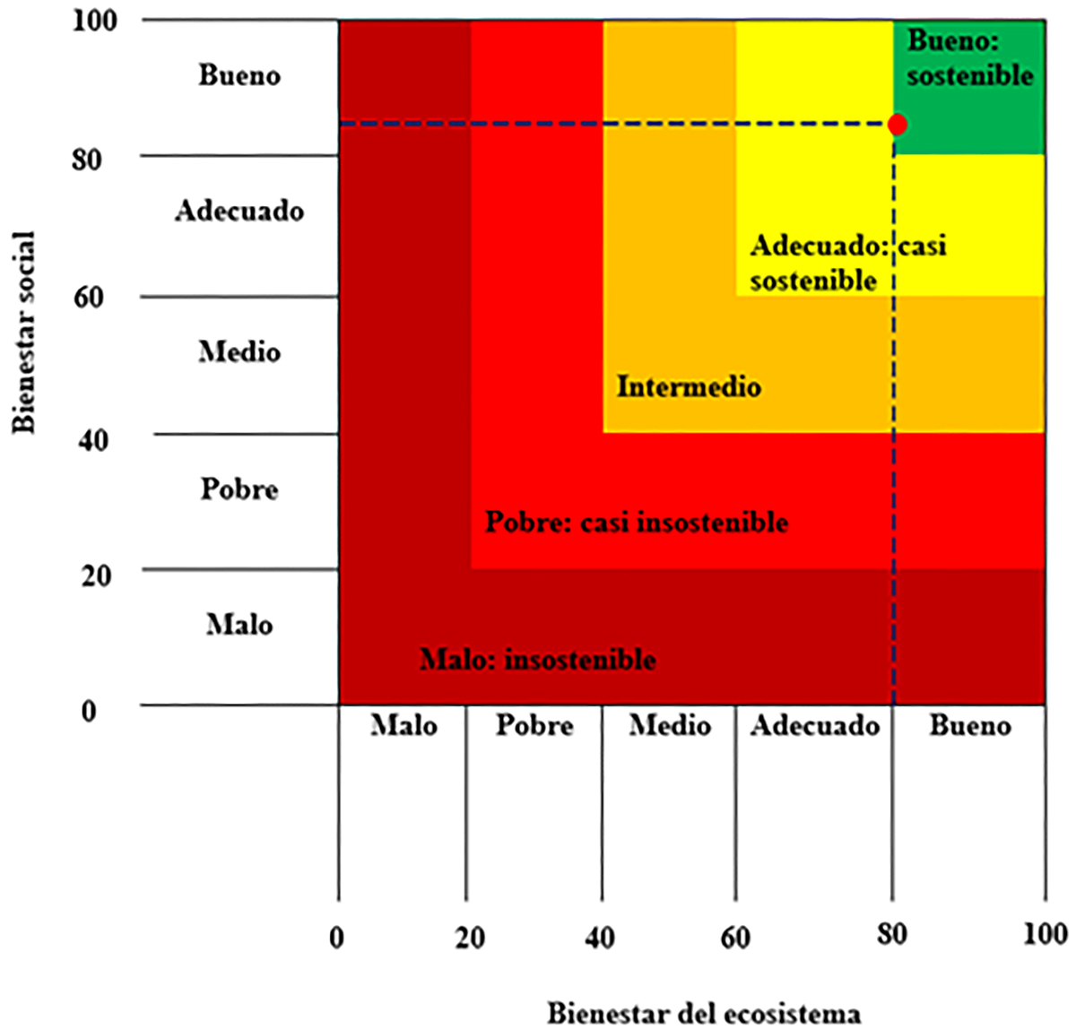Fuente: Elaboración propia. Huerta-Saavedra 2023. Modificado de la Unión Internacional para la Conservación de la Naturaleza (IUCN). Barómetro de la Sostenibilidad que ejemplifica el nivel de sostenibilidad de un ejido forestal en la UMAFOR Valle y Cofre de Perote en el estado de Veracruz.