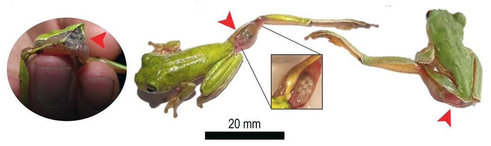 Larva de Sarcophagidae parasitando una rana. Foto: Flor G. Vázquez-Corzas, Adriana Sandoval-Comte, Patricia Hernández-López, Sergio Ibáñez-Bernal y Eduardo Pineda